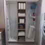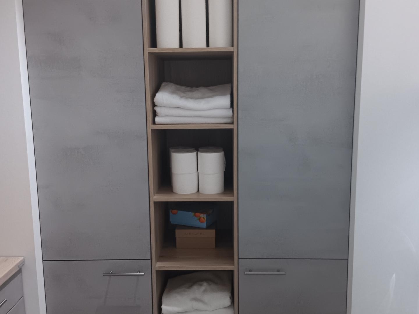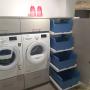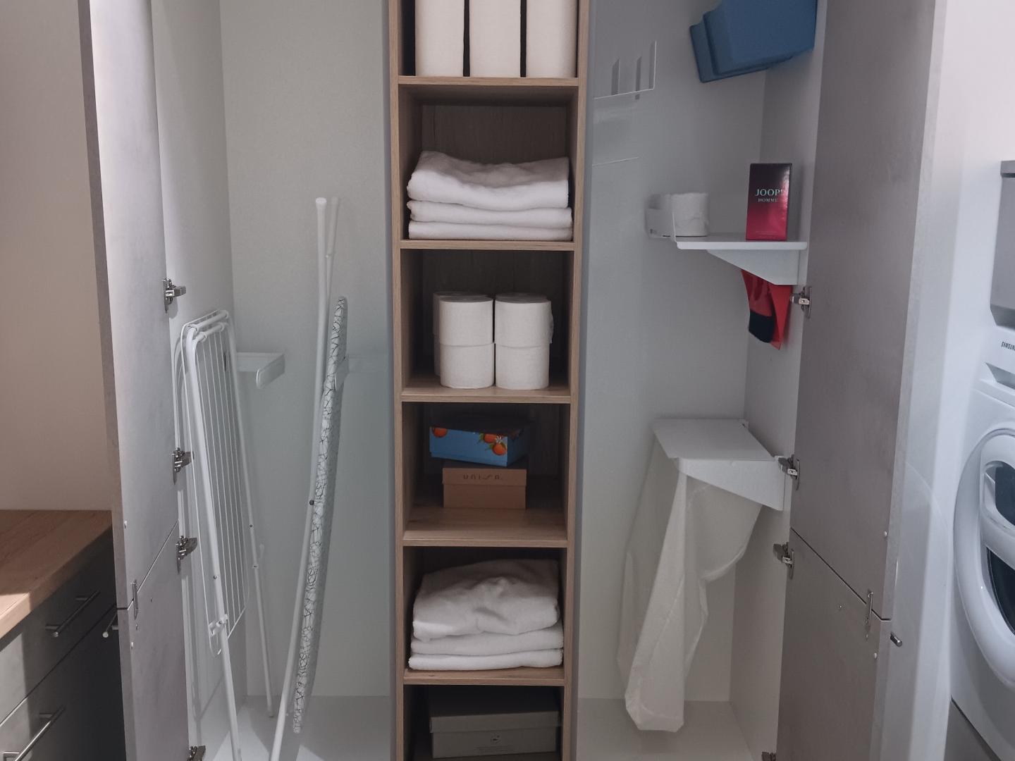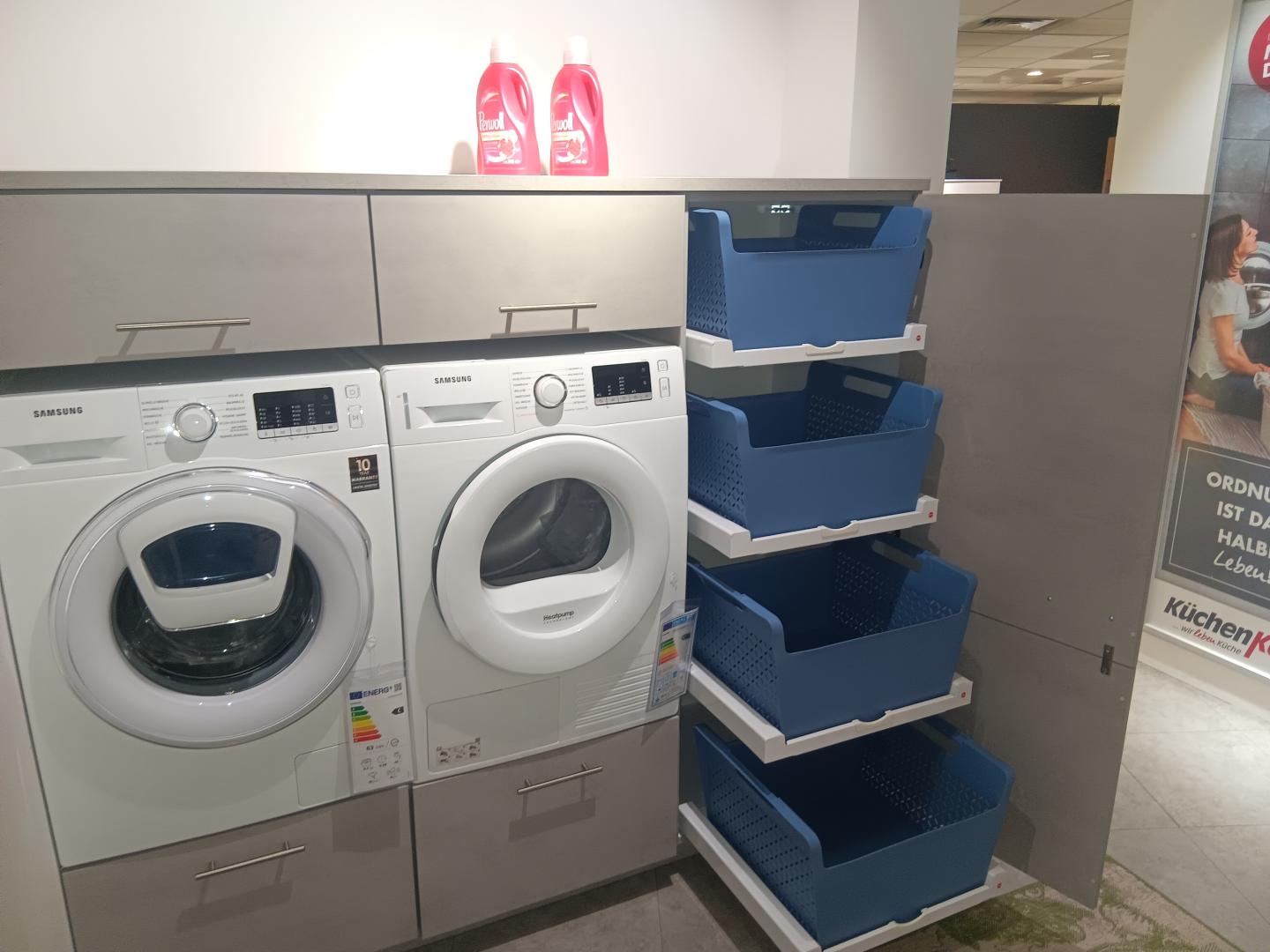 Moderner und geräumiger Hauswirtschaftsraum mit clever gelösten Wäschekörben, einer hoch gebauten Waschmaschine, sowie einem Wäschetrockner von Samsung. Dieser großartige Hauswirtschaftsraum bietet Platz für alle wichtigen Geräte des täglichen Gebrauchs, wie Staubsauger, Besen, Mob und Bügelstation. Weiter bietet der Raum Platz für aller Hand Reinigungsmittel, verfügt über einen Geräumigen Abfallsammler und einem ausziehbaren Tisch, für noch mehr Platz.