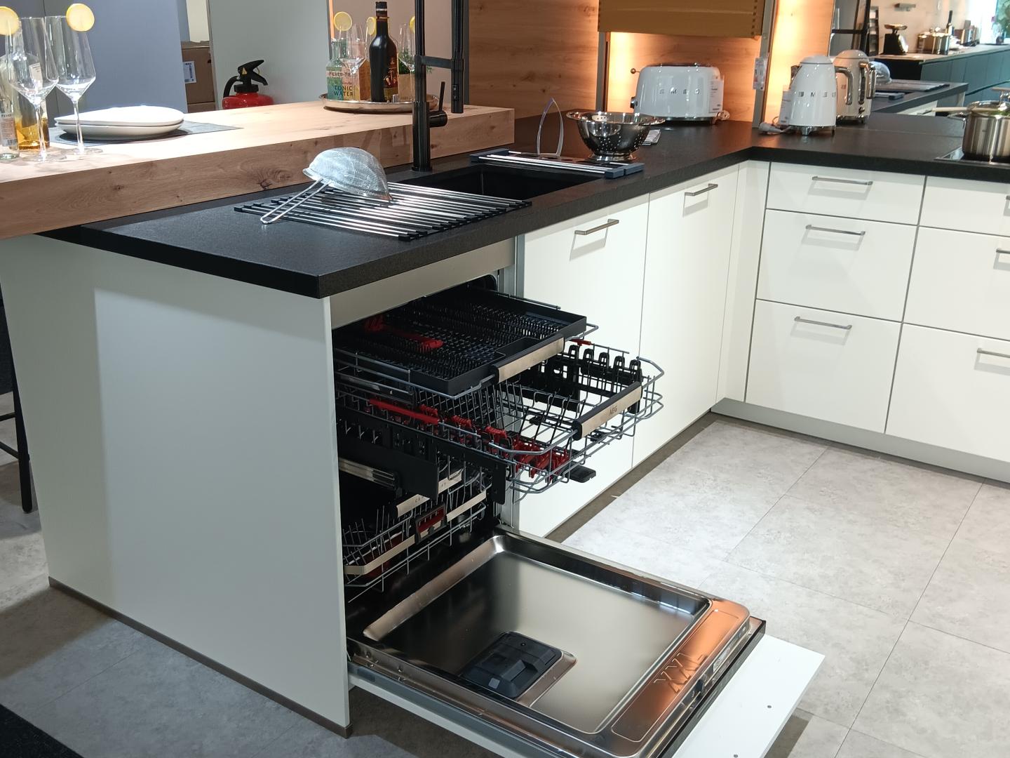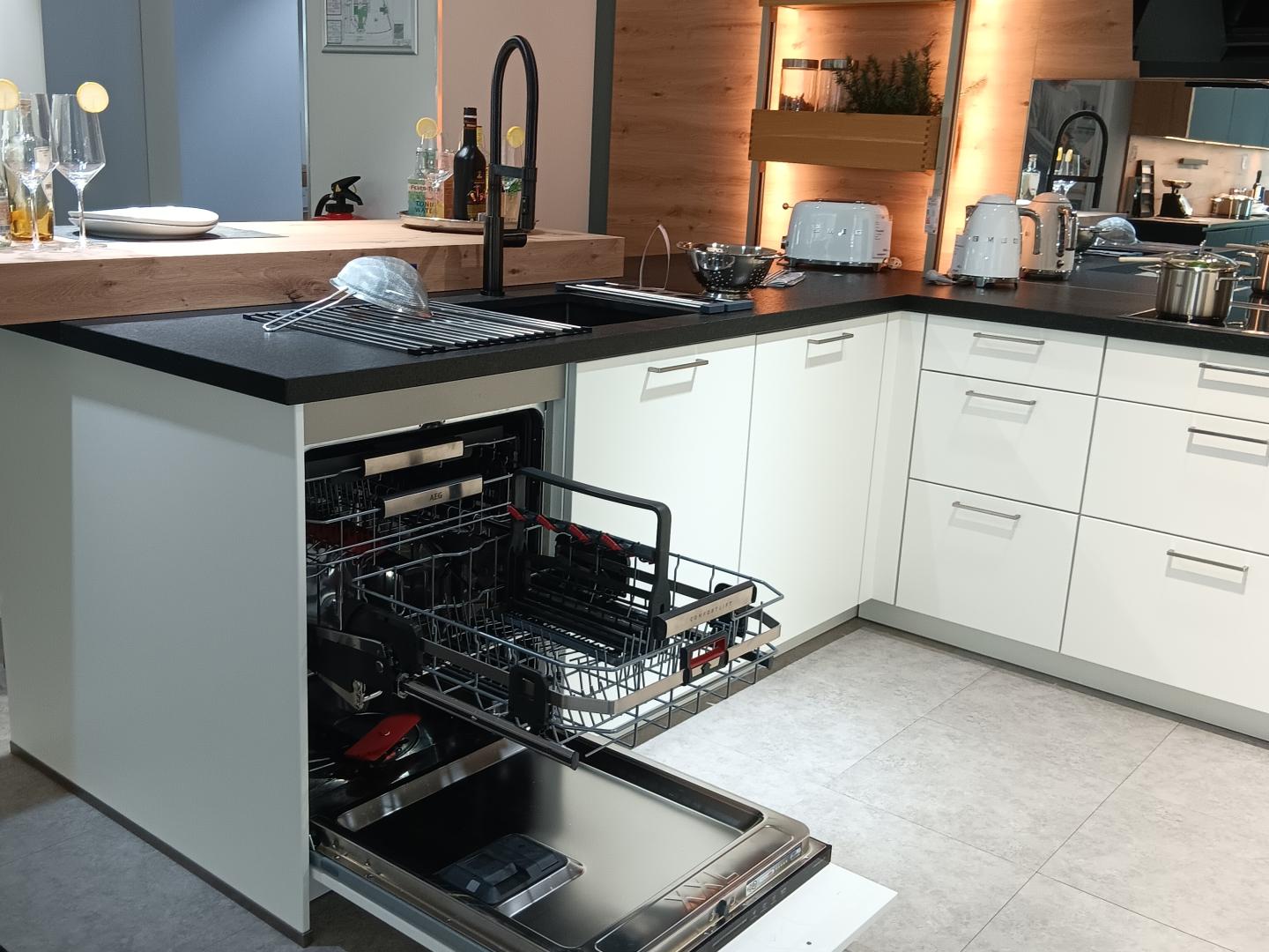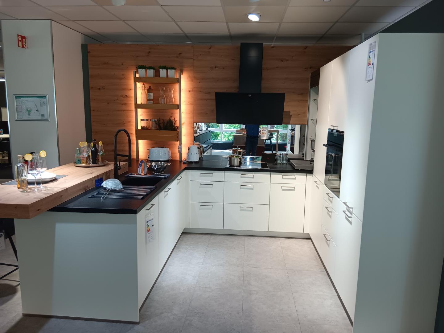 Moderne Nobilia U-Küche mit weißen allseits gerundeten matt lackierten Fronten, hochwertigen AEG Einbaugeräten, einer Nero Assoluto Z (geflammt & gebürstet) Arbeitsplatten-Anlage, sowie einem Villeroy und Boch Unterbau Spülbecken. Weiter ist diese schöne Küche mit einem Rollladenschrank, beleuchteten Kräuter-Kästen und einer Pult-Theken Platte in der Holzfarbe Artisan ausgestattet.