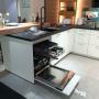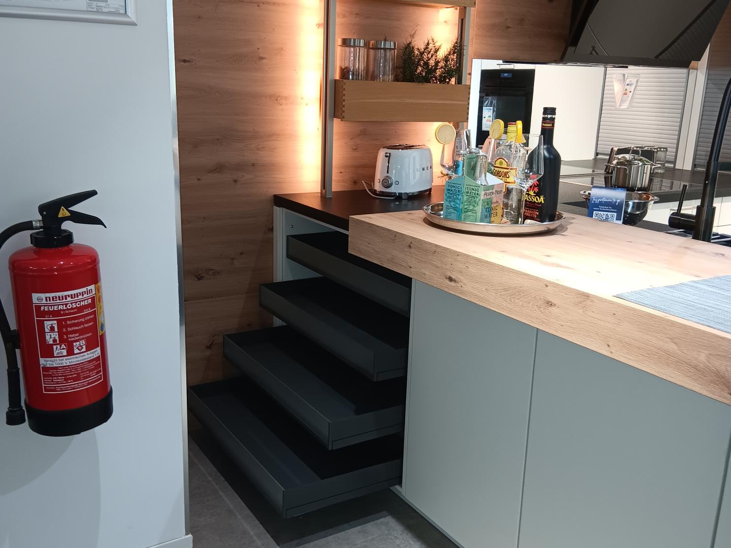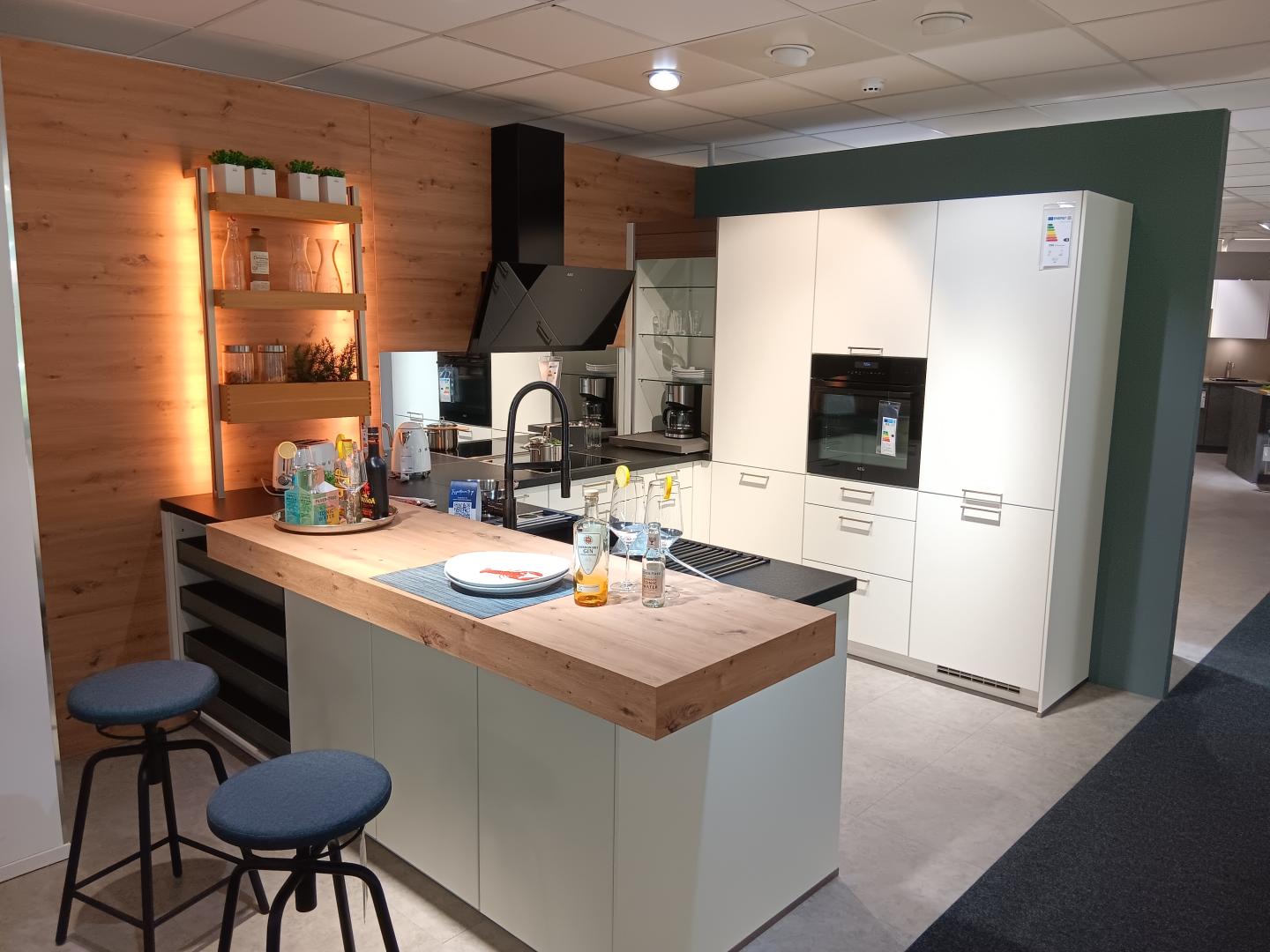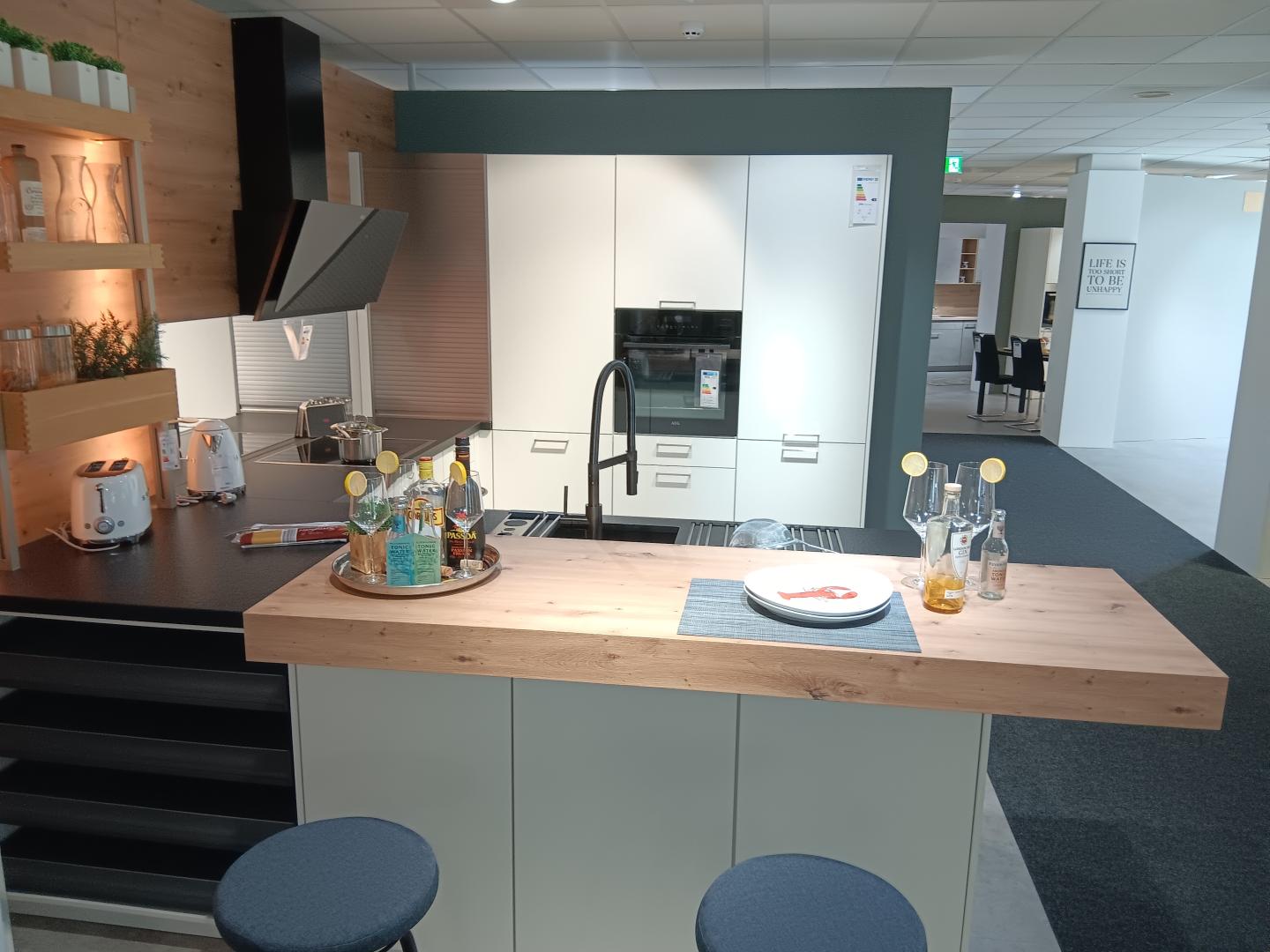 Moderne Nobilia U-Küche mit weißen allseits gerundeten matt lackierten Fronten, hochwertigen AEG Einbaugeräten, einer Nero Assoluto Z (geflammt & gebürstet) Arbeitsplatten-Anlage, sowie einem Villeroy und Boch Unterbau Spülbecken. Weiter ist diese schöne Küche mit einem Rollladenschrank, beleuchteten Kräuter-Kästen und einer Pult-Theken Platte in der Holzfarbe Artisan ausgestattet.