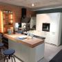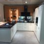 Koje 19 - Moderne U-Küche mit Theke, in weiß matt Lack und Naturstein Arbeitsplatte