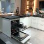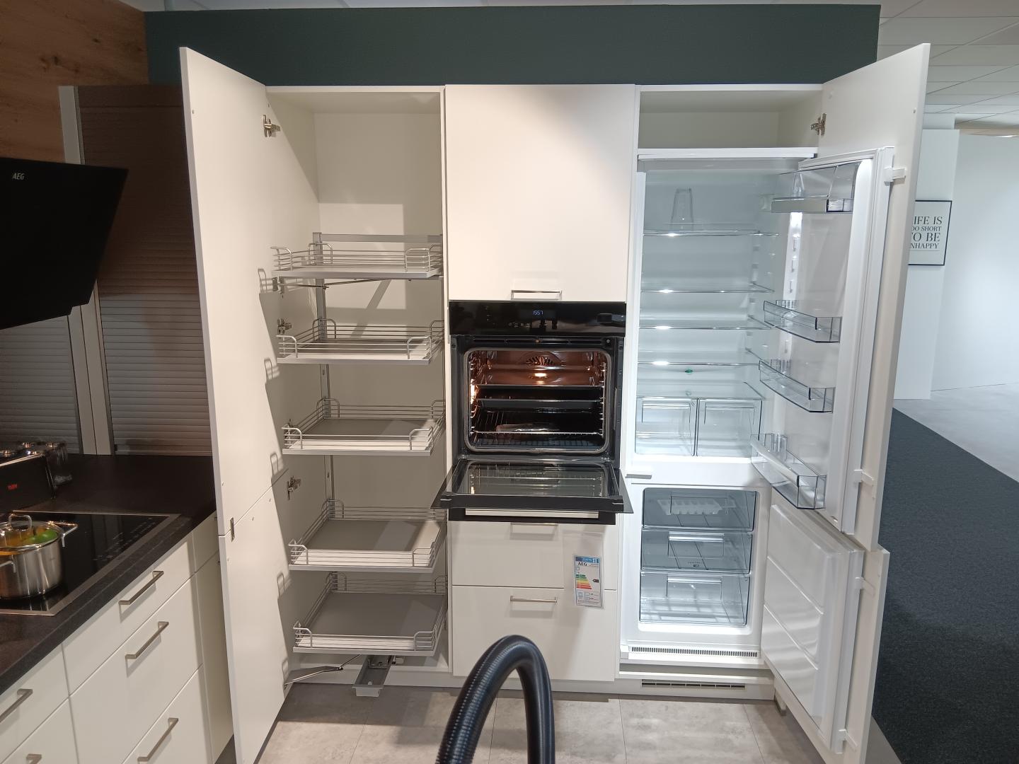 Moderne Nobilia U-Küche mit weißen allseits gerundeten matt lackierten Fronten, hochwertigen AEG Einbaugeräten, einer Nero Assoluto Z (geflammt & gebürstet) Arbeitsplatten-Anlage, sowie einem Villeroy und Boch Unterbau Spülbecken. Weiter ist diese schö...